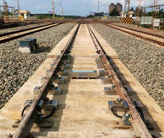 無梁式不斷軌自動(dòng)軌道衡是機(jī)械結(jié)構(gòu)、電氣系統(tǒng)及軟件控制于一體的成套計(jì)量控制系統(tǒng),它由預(yù)埋板、承載器、稱重傳感器、接線箱、稱重儀表、鐵路車號(hào)識(shí)別系統(tǒng)、工業(yè)控制計(jì)算機(jī)、計(jì)量管理軟件等幾部分組成。